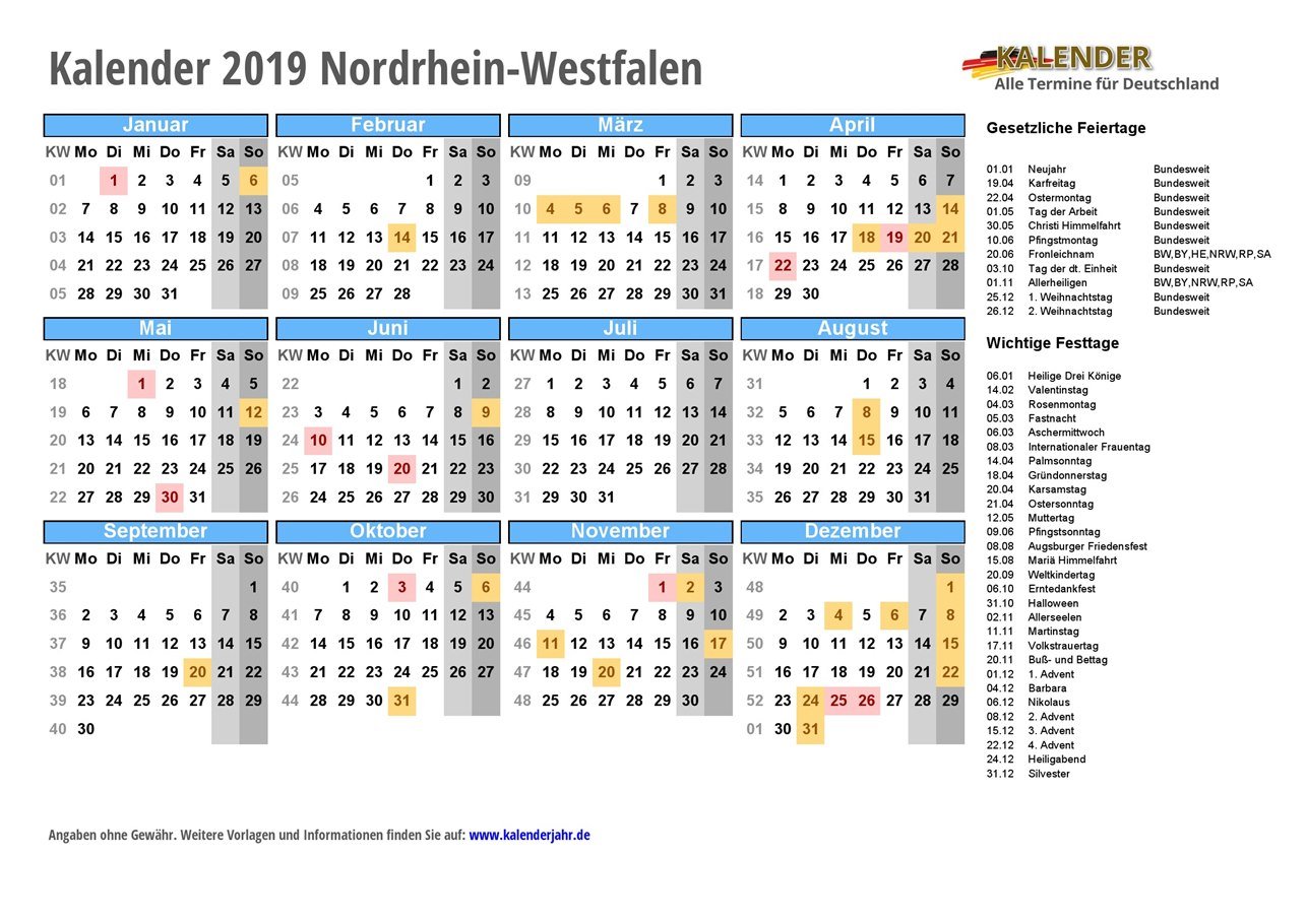 - Kalender 2019 Nordrhein-Westfalen