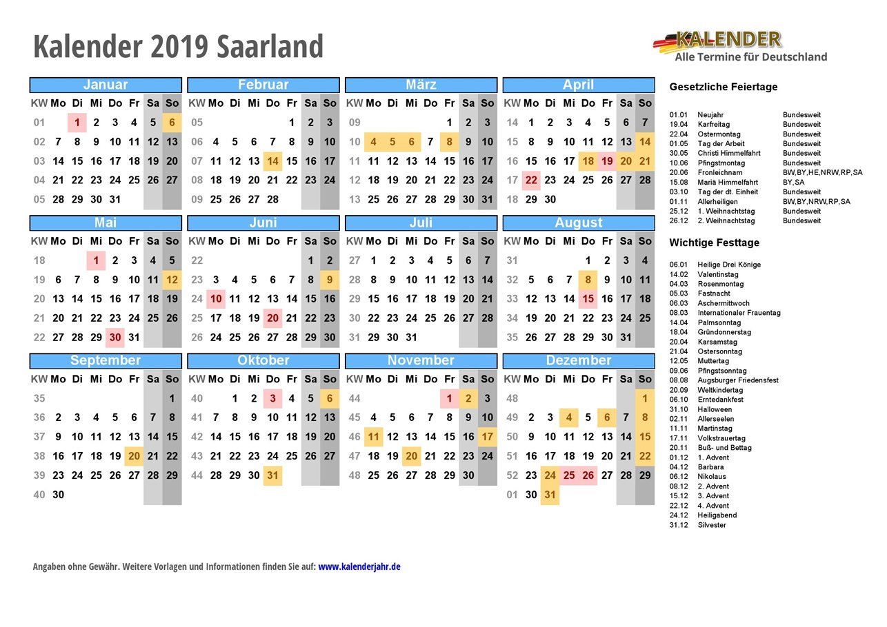 Kalender 2019 Saarland zum Ausdrucken
