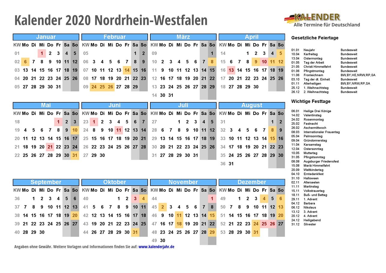 - Kalender 2020 Nordrhein-Westfalen