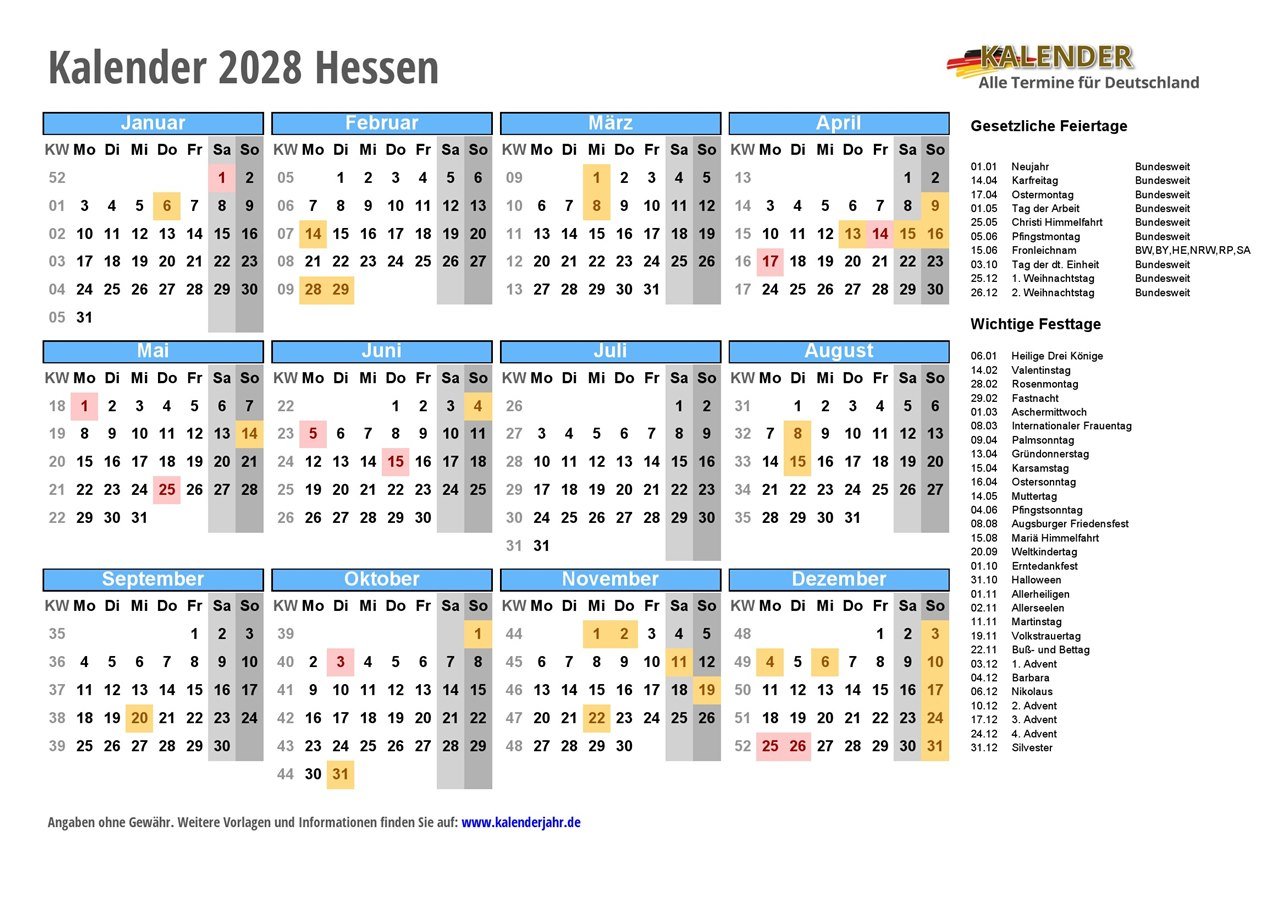 Kalender 2028 Nordrhein-Westfalen zum Ausdrucken