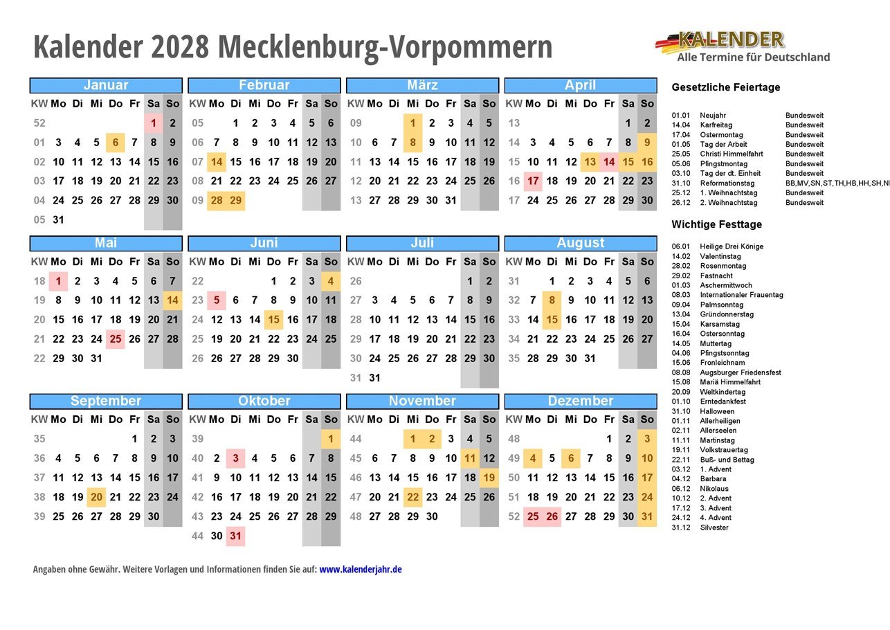 Kalender 2028 Mecklenburg-Vorpommern zum Ausdrucken