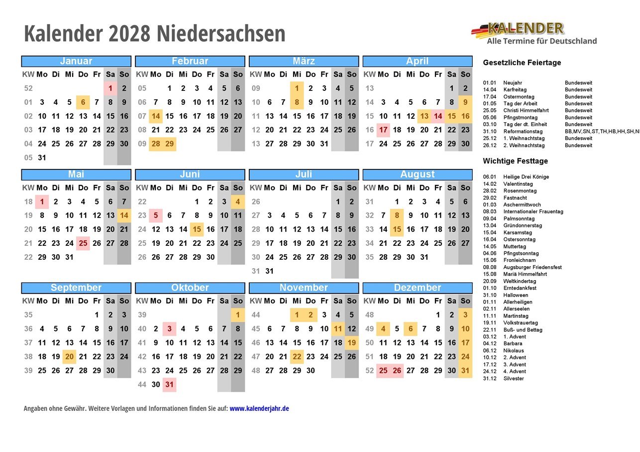 Kalender 2028 Niedersachsen zum Ausdrucken
