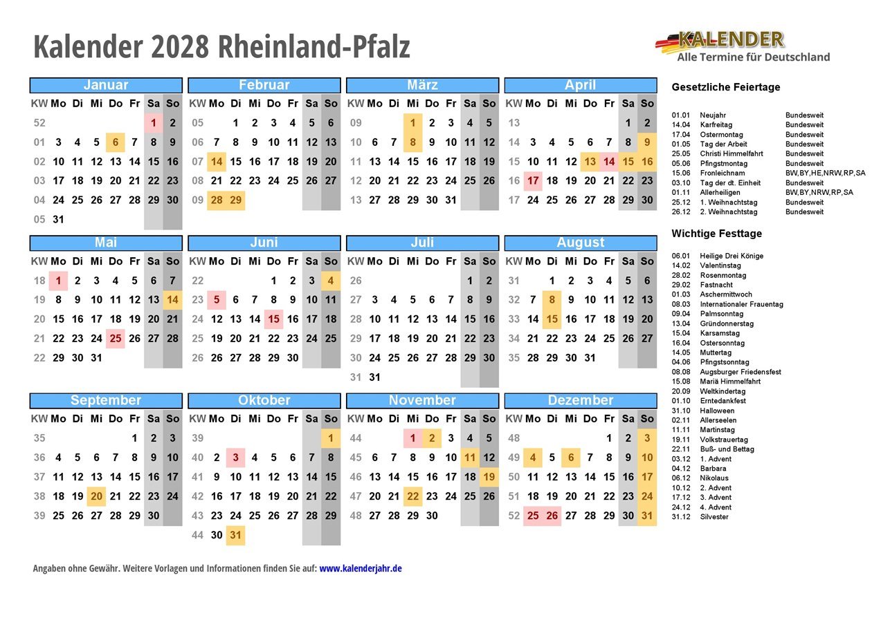 Kalender 2028 Rheinland-Pfalz zum Ausdrucken