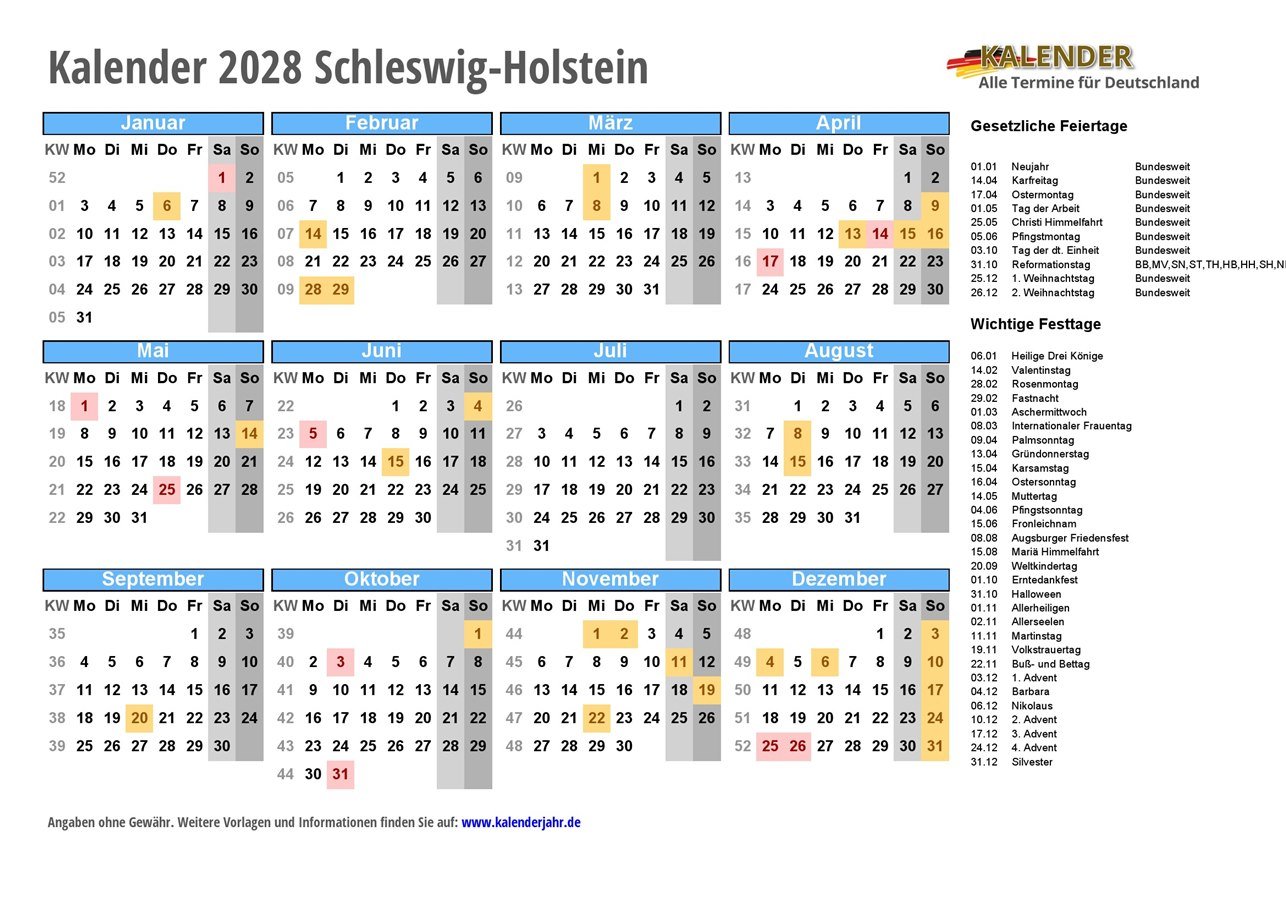 Kalender 2028 Schleswig-Holstein zum Ausdrucken