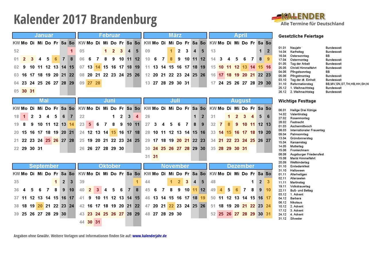 Kalender für 2017 in Brandenburg - mit bundesweiten und regionalen Feiertagen und PDF / JPG / EXCEL-Vorlagen zum Ausdrucken und Download. Die Feiertage sind ausführlich beschrieben und enthalten auch zusätzlich Hinweise zu den Sonderregelungen bei religiösen Feiertagen und den schulfreien Tagen für Schüler mit unterschiedlichem Glaubensbekenntnis.