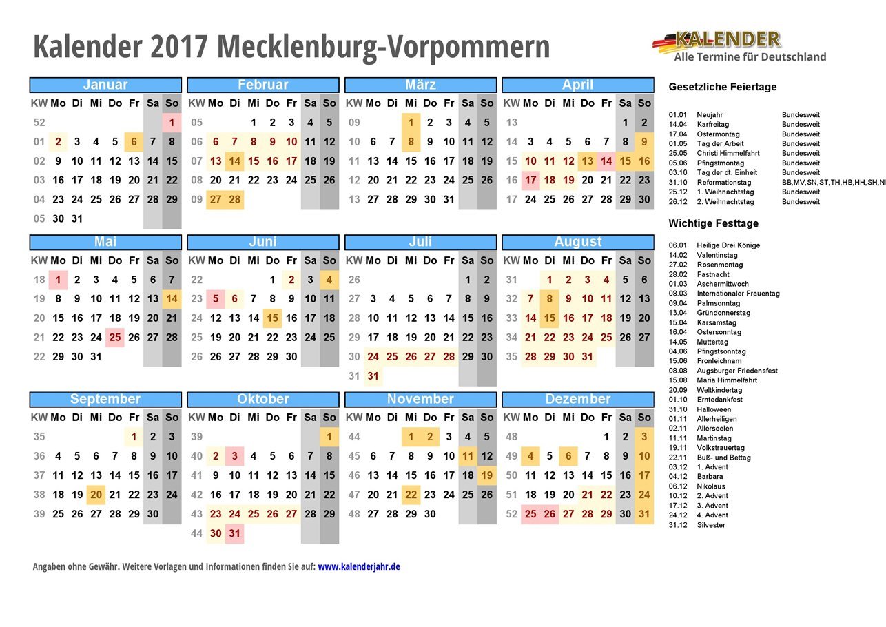 Kalender für 2017 in Mecklenburg-Vorpommern - mit bundesweiten und regionalen Feiertagen und PDF / JPG / EXCEL-Vorlagen zum Ausdrucken und Download. Die Feiertage sind ausführlich beschrieben und enthalten auch zusätzlich Hinweise zu den Sonderregelungen bei religiösen Feiertagen und den schulfreien Tagen für Schüler mit unterschiedlichem Glaubensbekenntnis.