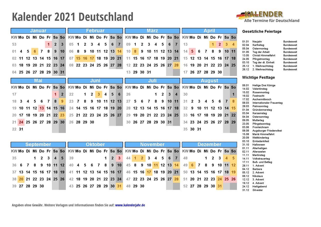 Kalender für 2021 in Deutschland - mit bundesweiten und regionalen Feiertagen und PDF / JPG / EXCEL-Vorlagen zum Ausdrucken und Download. Die Feiertage sind ausführlich beschrieben und enthalten auch zusätzlich Hinweise zu den Sonderregelungen bei religiösen Feiertagen und den schulfreien Tagen für Schüler mit unterschiedlichem Glaubensbekenntnis.