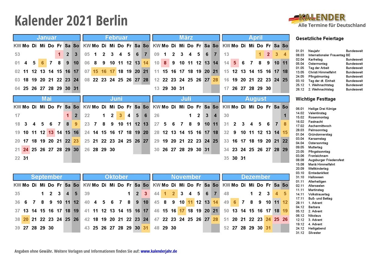 Kalender für 2021 in Berlin - mit bundesweiten und regionalen Feiertagen und PDF / JPG / EXCEL-Vorlagen zum Ausdrucken und Download. Die Feiertage sind ausführlich beschrieben und enthalten auch zusätzlich Hinweise zu den Sonderregelungen bei religiösen Feiertagen und den schulfreien Tagen für Schüler mit unterschiedlichem Glaubensbekenntnis.