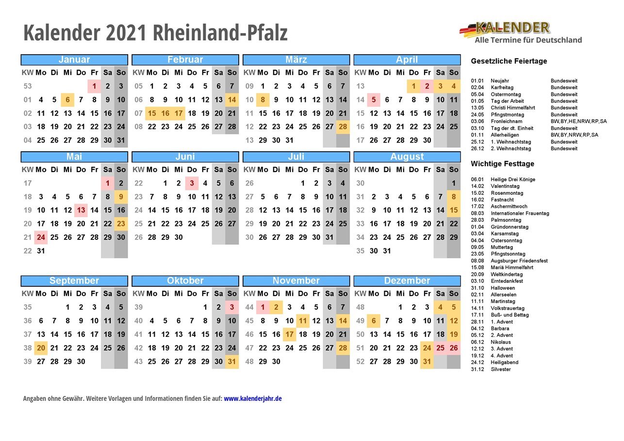 Kalender für 2021 in Rheinland-Pfalz - mit bundesweiten und regionalen Feiertagen und PDF / JPG / EXCEL-Vorlagen zum Ausdrucken und Download. Die Feiertage sind ausführlich beschrieben und enthalten auch zusätzlich Hinweise zu den Sonderregelungen bei religiösen Feiertagen und den schulfreien Tagen für Schüler mit unterschiedlichem Glaubensbekenntnis.