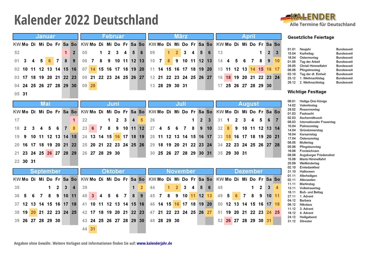 Kalender für 2022 in Deutschland - mit bundesweiten und regionalen Feiertagen und PDF / JPG / EXCEL-Vorlagen zum Ausdrucken und Download. Die Feiertage sind ausführlich beschrieben und enthalten auch zusätzlich Hinweise zu den Sonderregelungen bei religiösen Feiertagen und den schulfreien Tagen für Schüler mit unterschiedlichem Glaubensbekenntnis.