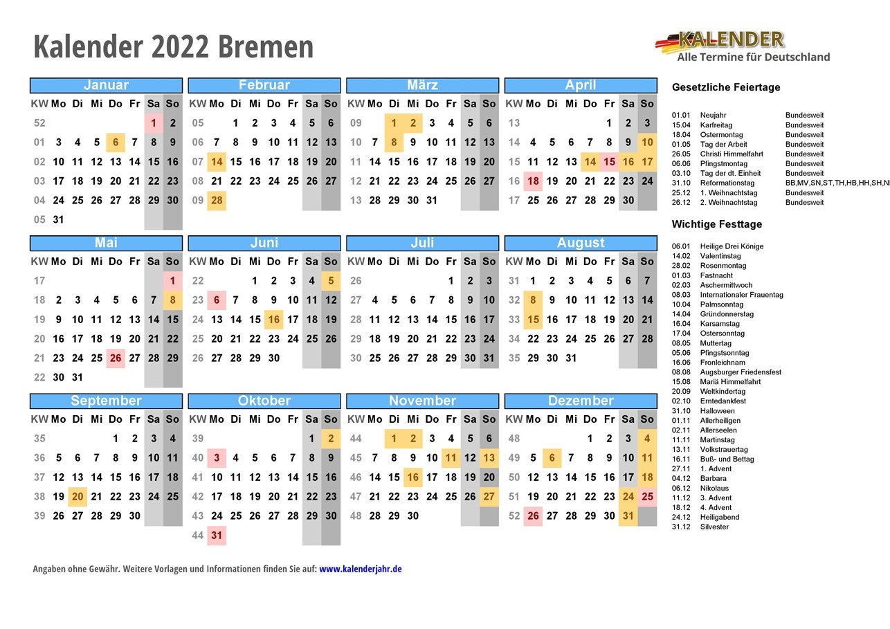 Kalender für 2022 in Bremen - mit bundesweiten und regionalen Feiertagen und PDF / JPG / EXCEL-Vorlagen zum Ausdrucken und Download. Die Feiertage sind ausführlich beschrieben und enthalten auch zusätzlich Hinweise zu den Sonderregelungen bei religiösen Feiertagen und den schulfreien Tagen für Schüler mit unterschiedlichem Glaubensbekenntnis.
